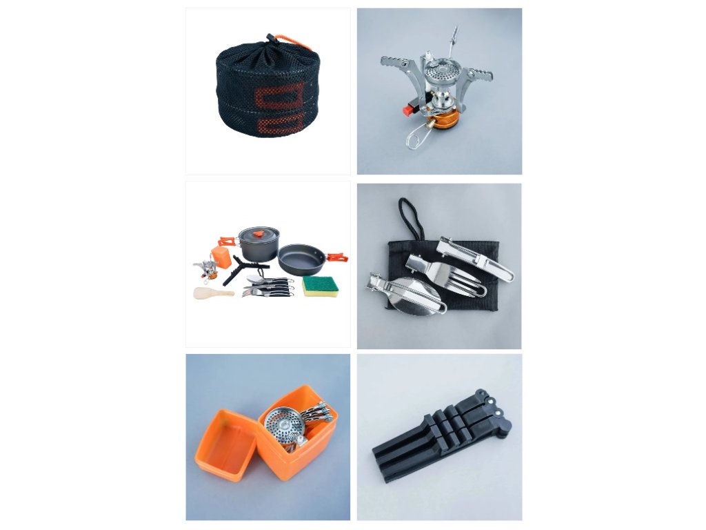 Sada kempingového nádobí s plynovým hořákem a příbory