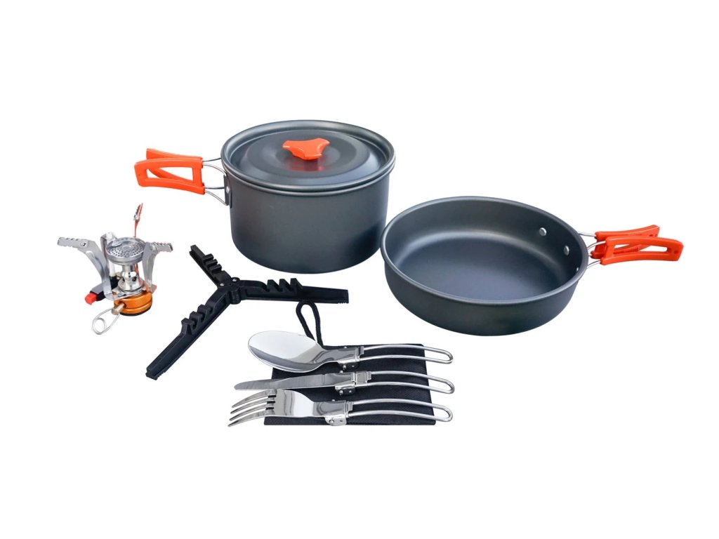 Praktická a dobře vybavená turistická sada pro venkovní vaření – ideální na cesty, do kempu nebo na túry. Díky lehkému hliníkovému provedení a kompaktním rozměrům ji snadno sbalíte do batohu a vezmete kamkoliv s sebou.