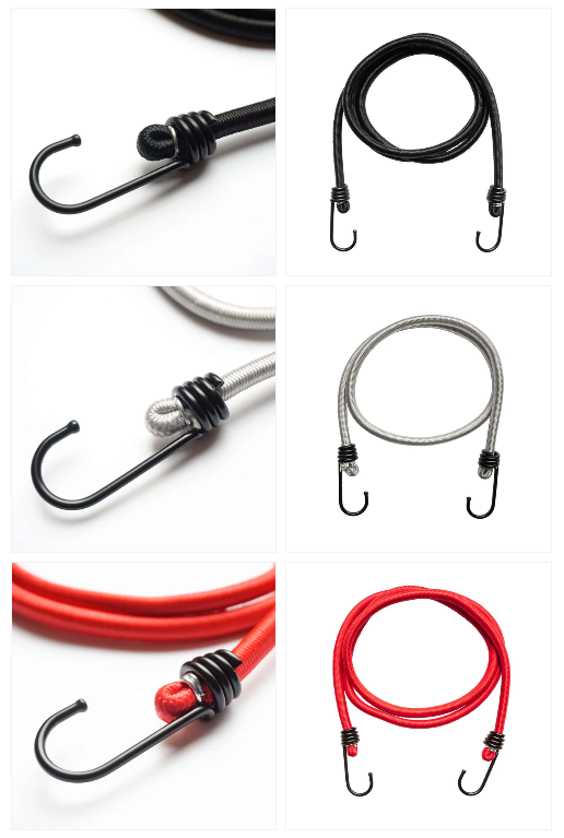 Vyrobeno z odolné pryže potažené polypropylenovou šňůrou. Kovové spony na koncích pro rychlé a pohodlné připevnění.