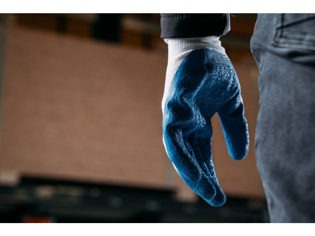 Kvalitní pracovní ochranné rukavice Tekson potažené drsným pěnovým latexem v dlani a na prstech.